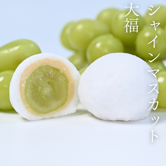 山形県産高級ぶどう「シャインマスカット」の選りすぐりの大粒を丸ごと一粒使い、白ぶどう天然果汁で練ったなめらかな白あんと山形県産つや姫米粉のふわふわお餅でやさしく包みました。芳醇な香りと瑞々しく爽やかな味をご堪能ください。